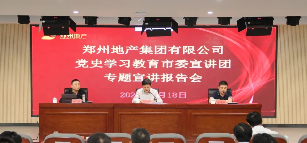 為持續(xù)推進黨史學習教育走深走實,5月18日上午,鄭州市委宣講團走進鄭州地產(chǎn)集團,在集團301多功能廳開展黨史學習教育專題宣講報告會。報告會由鄭州市委宣講團成員、鄭州工程技術(shù)學院馬克思主義學院副教授張豪主講,市國資黨史學習教育第二巡回指導組組長、四級調(diào)研員段德強,指導組成員張詩雨、陳祥斐到會巡聽旁聽,地產(chǎn)集團領(lǐng)導班子、總部全體員工,各子公司支部書記、黨建部門負責人等共計150余人參加現(xiàn)場報告會,各子公司員工共計170余人通過線上直播進行觀看,會議由地產(chǎn)集團黨委書記、董事長萬永生主持。