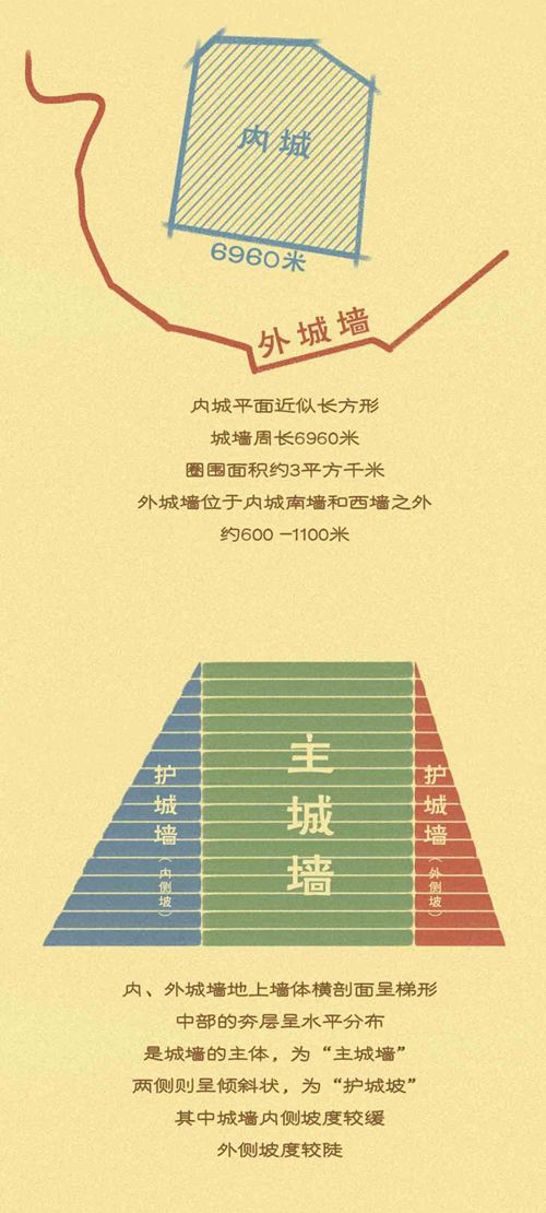 “鄭州商城遺址近似長方形,面積有二十五平方公里。城垣高大,北城墻長約1690米,西墻長約1870米,南墻和東墻長度均為1700米,周長近7公里。城墻底寬20米左右,頂寬5米多,其高度復原后約10米。”