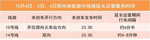 10月4日至6日,鄭州地鐵相關(guān)線路延長運營服務(wù)時間,請您留意“鄭州地鐵”微信公眾號。