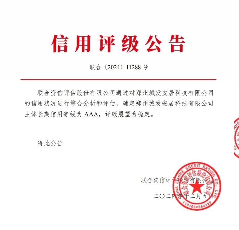 鄭州城發(fā)安居科技有限公司榮獲AAA主體信用評(píng)級(jí)