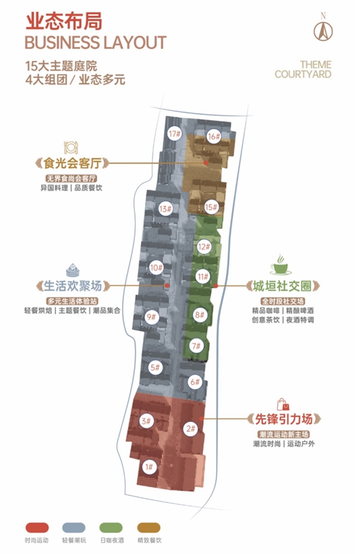 (十五個院落、四大組團業(yè)態(tài)分布示意圖)