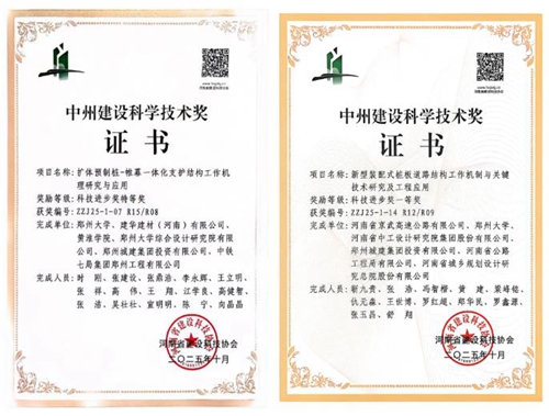 鄭州城建集團(tuán)的“擴(kuò)體預(yù)制樁—帷幕一體化支護(hù)結(jié)構(gòu)工作機(jī)理研究與應(yīng)用”與“新型裝配式樁板道路結(jié)構(gòu)工作機(jī)制與關(guān)鍵技術(shù)研究及工程應(yīng)用”兩項(xiàng)科研項(xiàng)目,分獲河南省“中州建設(shè)科學(xué)技術(shù)獎(jiǎng)”特等獎(jiǎng)和一等獎(jiǎng)。