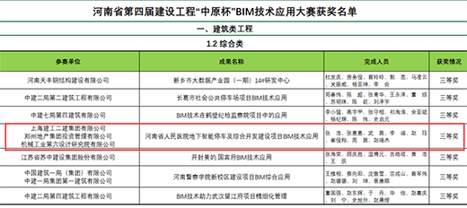 近日,由河南省住建廳指導(dǎo)、河南省建筑業(yè)協(xié)會主辦的河南省第四屆建設(shè)工程“中原杯”BIM技術(shù)應(yīng)用大賽獲獎名單揭曉,經(jīng)過層層評審,由鄭州地產(chǎn)集團投資管理有限公司主導(dǎo),上海建工二建集團有限公司、機械工業(yè)第六設(shè)計研究院有限公司配合完成申報的河南省人民醫(yī)院地下智能停車及綜合開發(fā)建設(shè)項目BIM技術(shù)應(yīng)用榮獲建筑類綜合成果三等獎。