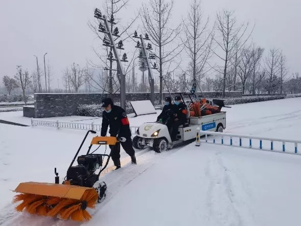 1月21日暴雪如期而至,鄭州奧體中心立刻根據(jù)雪情安排作業(yè)路段及區(qū)域,投入人員百余人、輔助工具近200個(gè),各類除雪輔助車輛5輛,融雪劑2噸,第一時(shí)間清除機(jī)動(dòng)車道、步道上的積雪,確保道路安全不結(jié)冰。對(duì)園區(qū)出入口、園區(qū)內(nèi)外環(huán)主要道路、建國飯店門廳、疫苗接種中心、辦公區(qū)域周邊做好除雪、防滑措施。