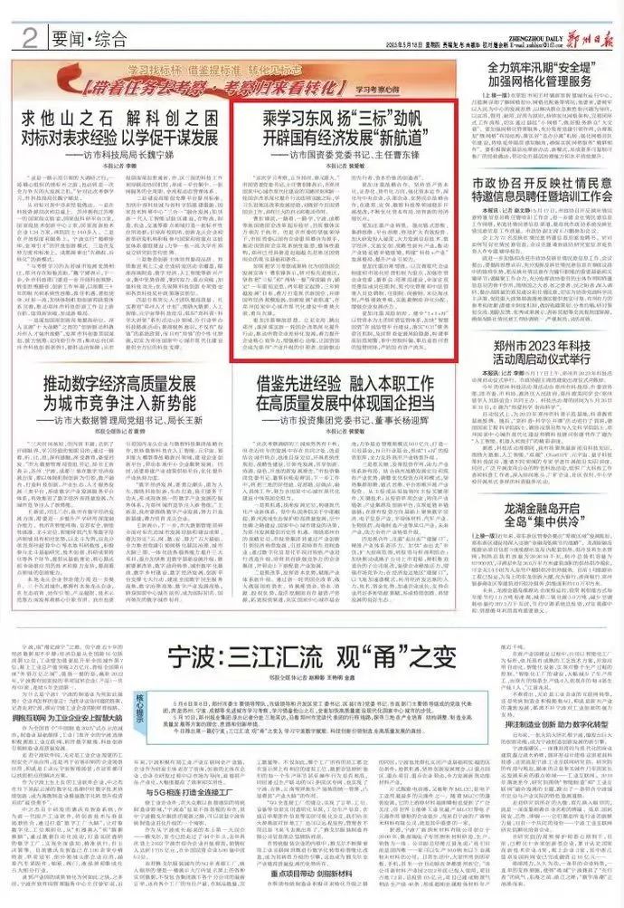 5月18日,《鄭州日報(bào)》刊發(fā)市國資委黨委書記、主任曹東鋒專訪文章《乘學(xué)習(xí)東風(fēng) 揚(yáng)“三標(biāo)”勁帆 開辟國有經(jīng)濟(jì)發(fā)展“新航道”》,為您全文分享如下——